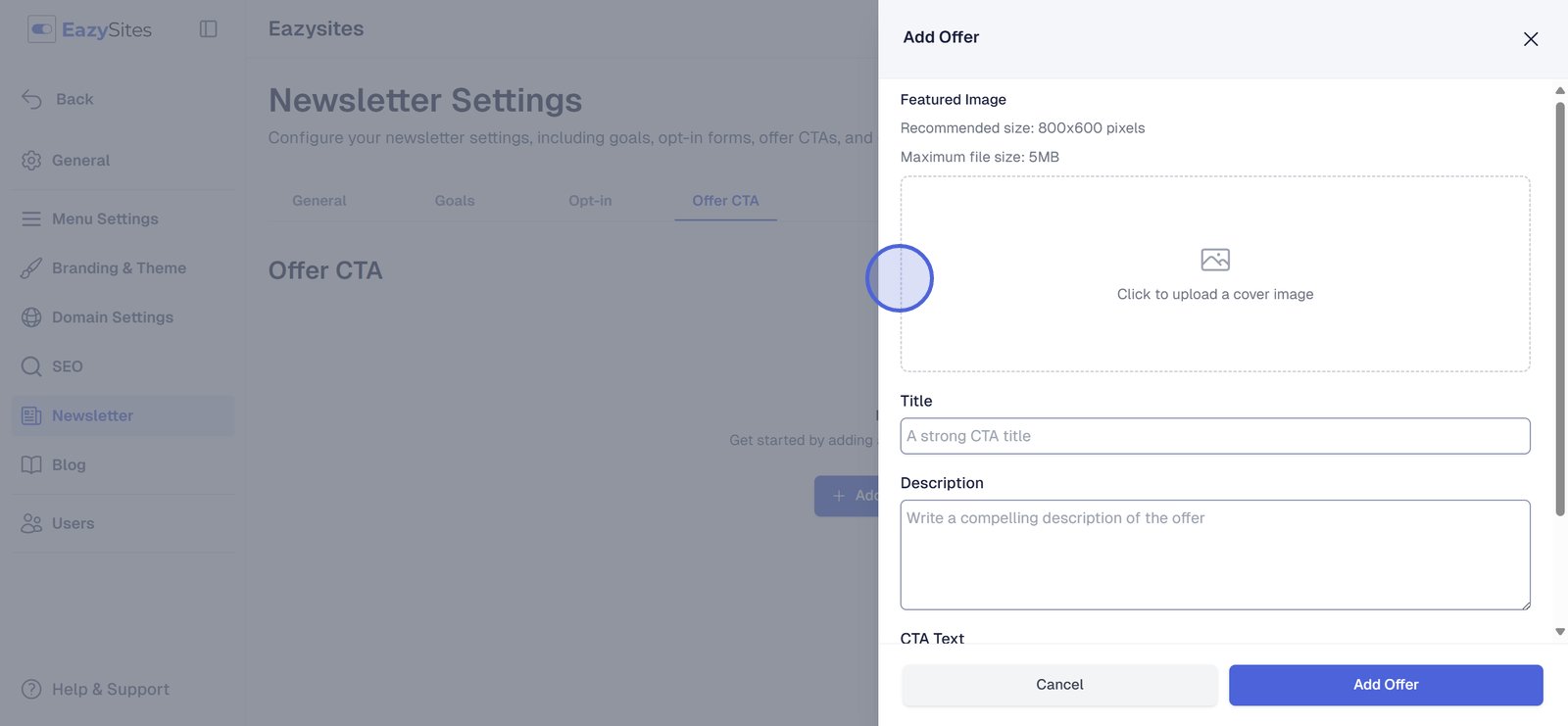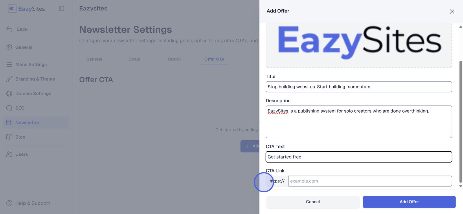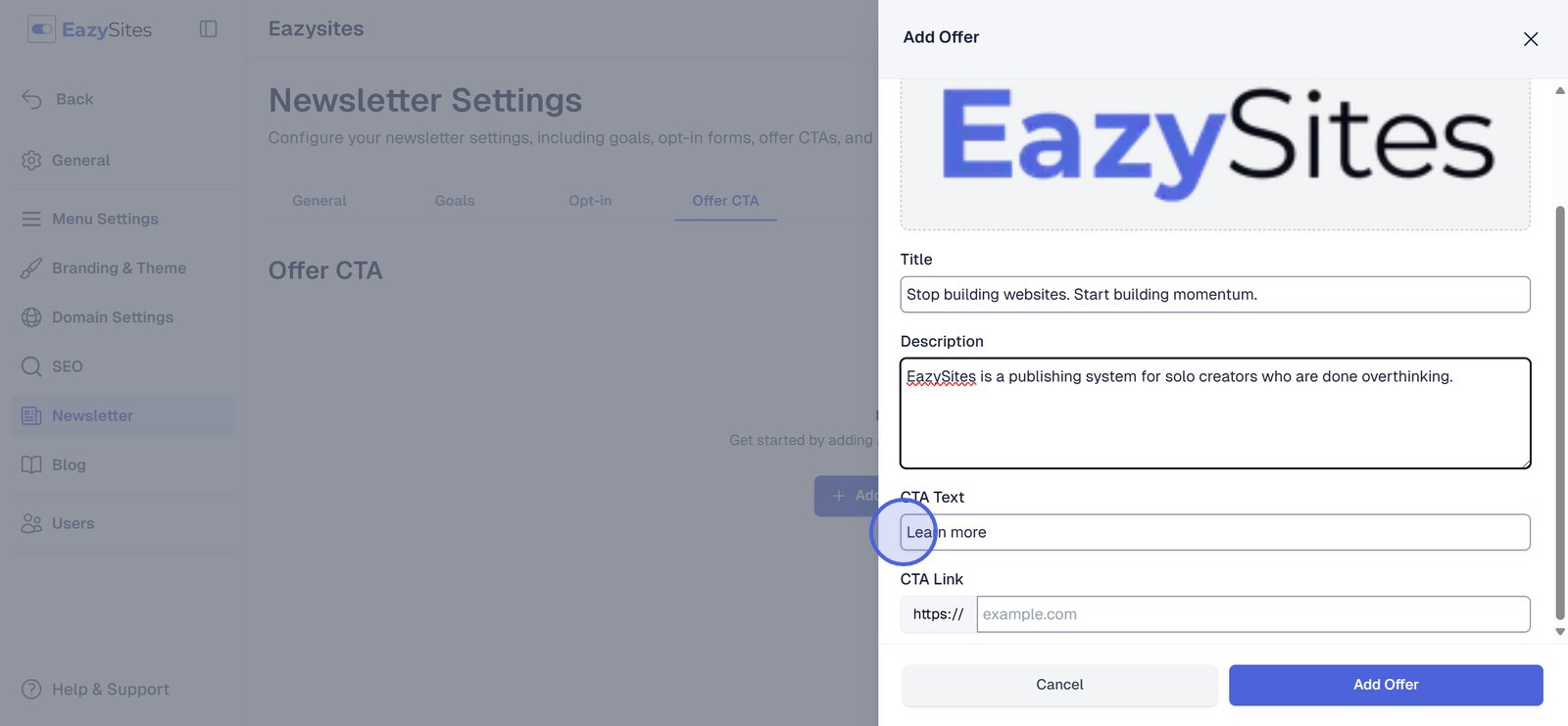 The Offer CTA is configured to display promotions prominently within the newsletter. Proper setup ensures each offer communicates its purpose effectively, guiding subscribers toward engagement and supporting the overall objectives of the newsletter.