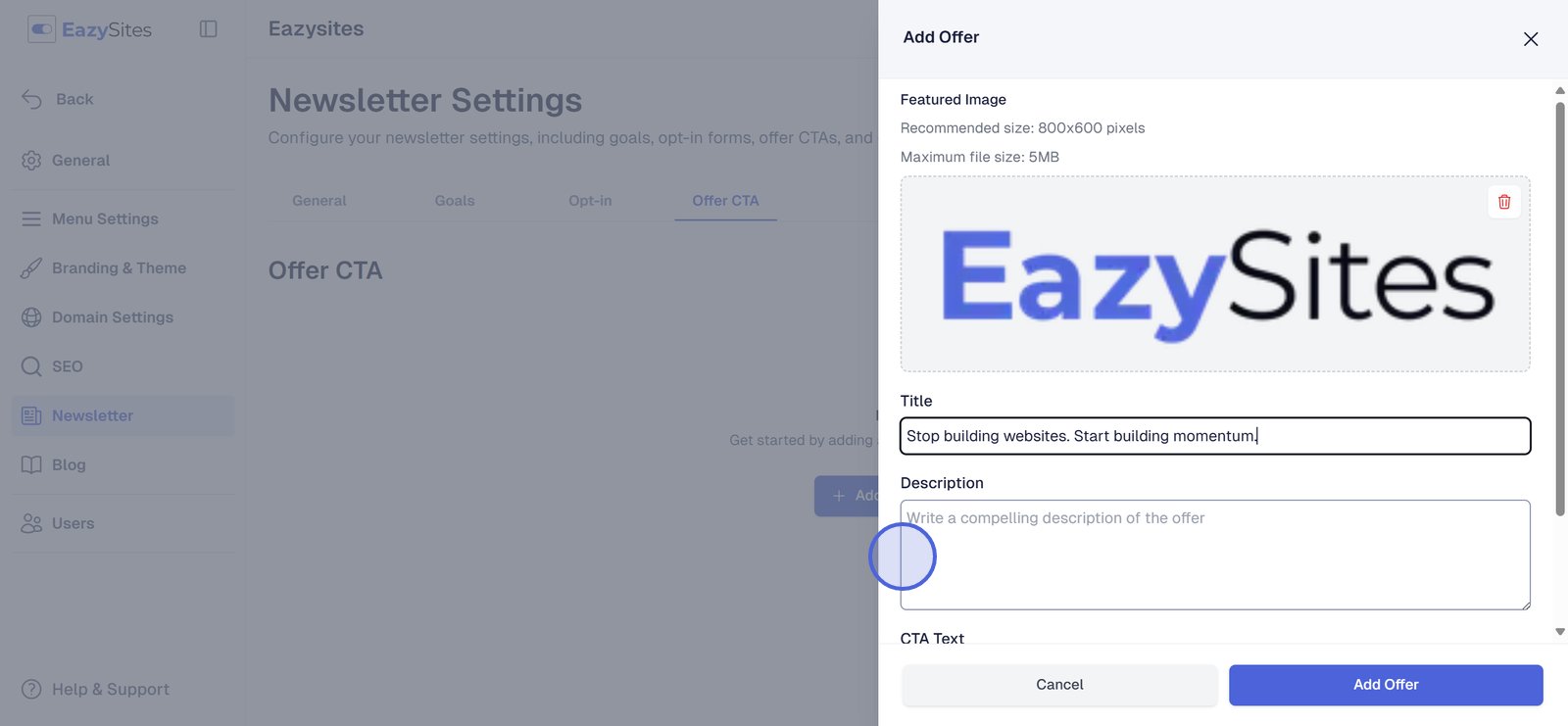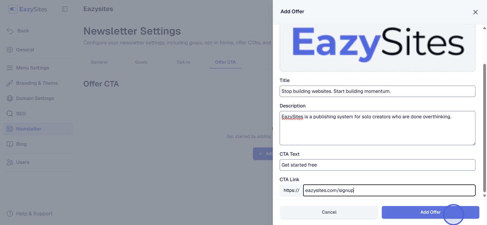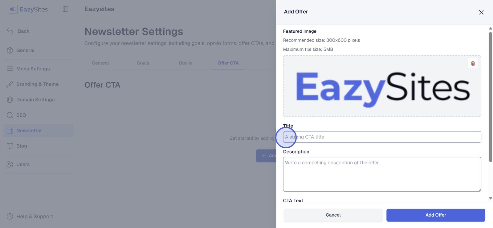 The Offer CTA is configured to display promotions prominently within the newsletter. Proper setup ensures each offer communicates its purpose effectively, guiding subscribers toward engagement and supporting the overall objectives of the newsletter.
