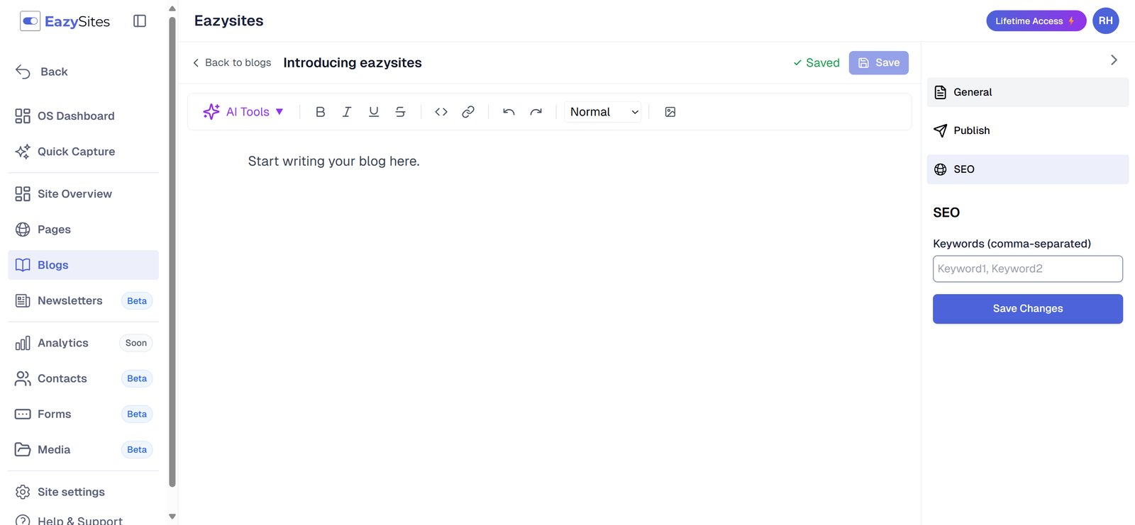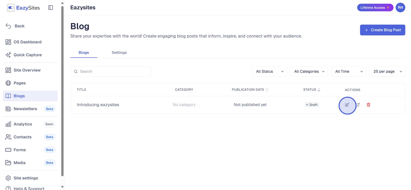 The use of categories lets readers navigate posts by topic. Categories are established in two ways: from the Site Settings, or directly within a blog post. This approach allows you to either define the structure beforehand or create categories while publishing.