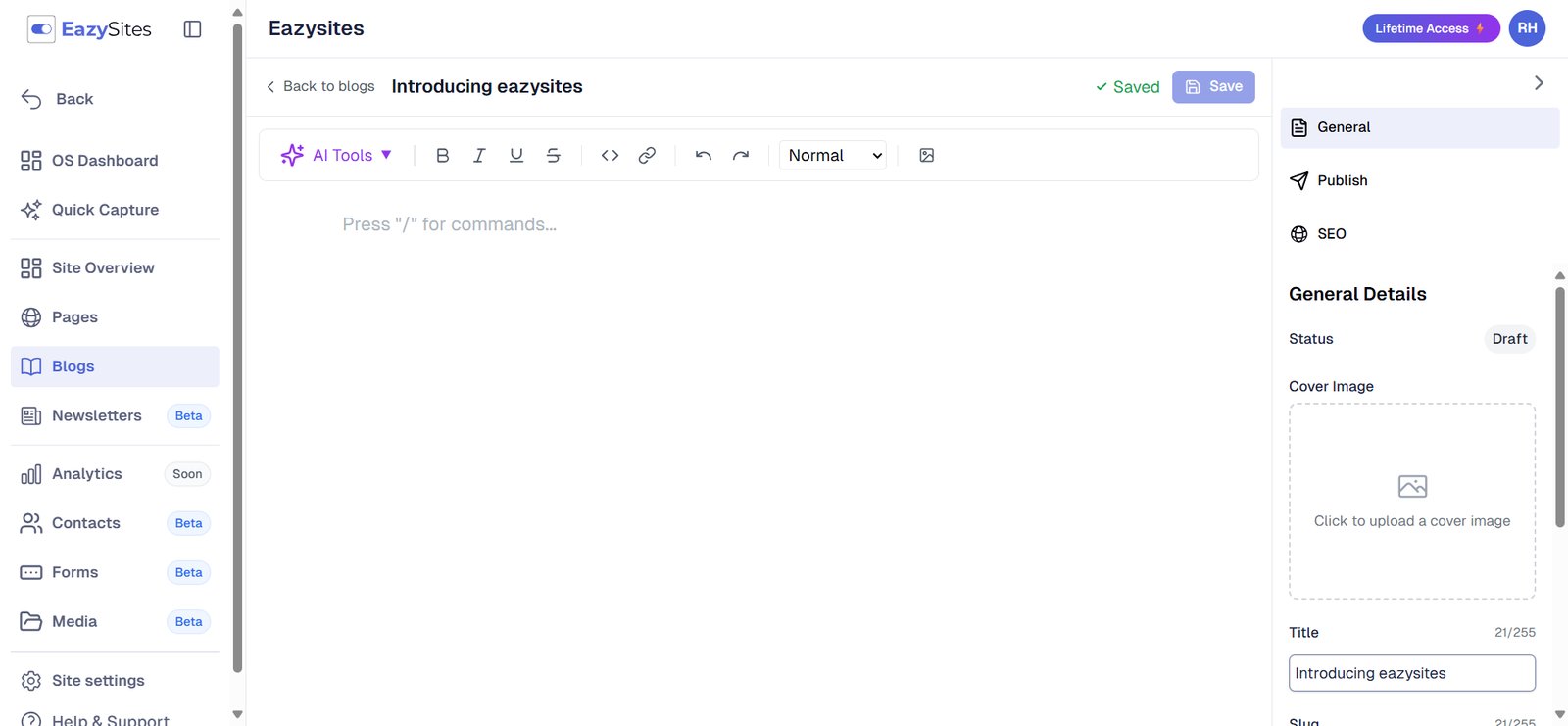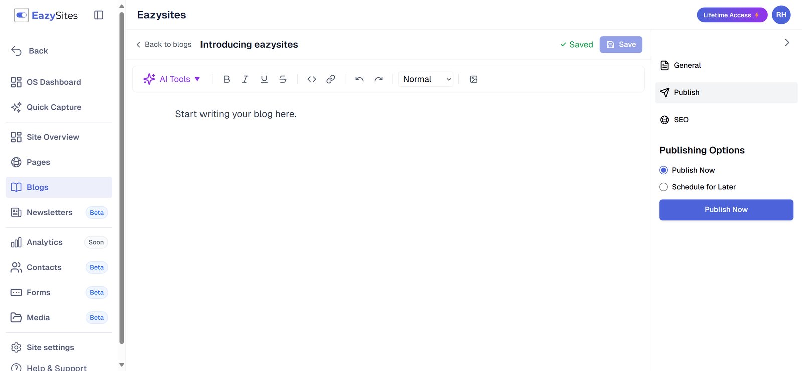 The EasySites editor provides tools for formatting text, structuring content, and incorporating AI features to support content creation. These features help streamline editing, ensure consistency, and optimize posts before publication.