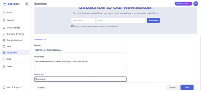 The newsletter opt-in form offers full customization to reflect the brand and optimize the subscriber experience. The following instructions explain how to navigate the settings, edit the form, and update its content.