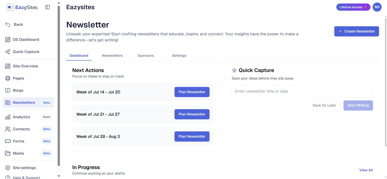 The Newsletter Dashboard provides a centralized view to manage newsletter activities. It allows users to plan upcoming newsletters, capture and store ideas, and track drafts in progress. The dashboard keeps newsletter work organized and makes it easy to move from capturing an idea to completing a draft.